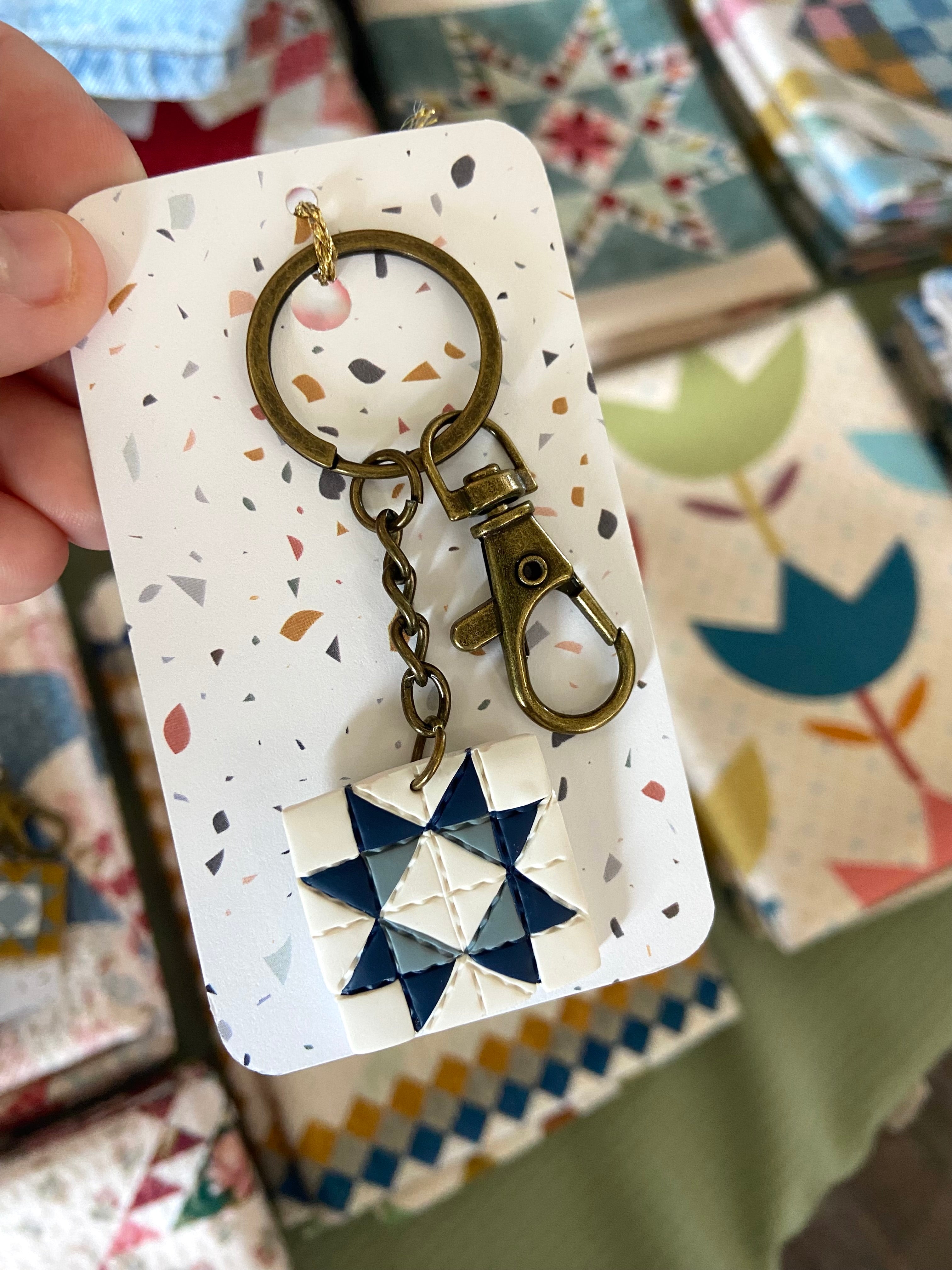 Unleash your inner whimsy with the Cottage Bliss Quilt Pattern Keychain! Handcrafted with clay, this keychain is a unique and playful accessory. Show off your love for all things cottage and cozy with this one-of-a-kind piece. Perfect for adding a touch of personality to your keys.