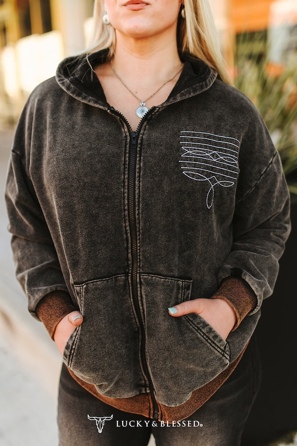 Wrap yourself in pure comfort with this mineral wash black zip-up jacket—soft, cozy, and made for those days when comfort is everything. Featuring charming embroidered boot stitch detailing that nods to western heritage, it's the perfect layer for relaxed vibes and effortless style. Slip it on and settle in.