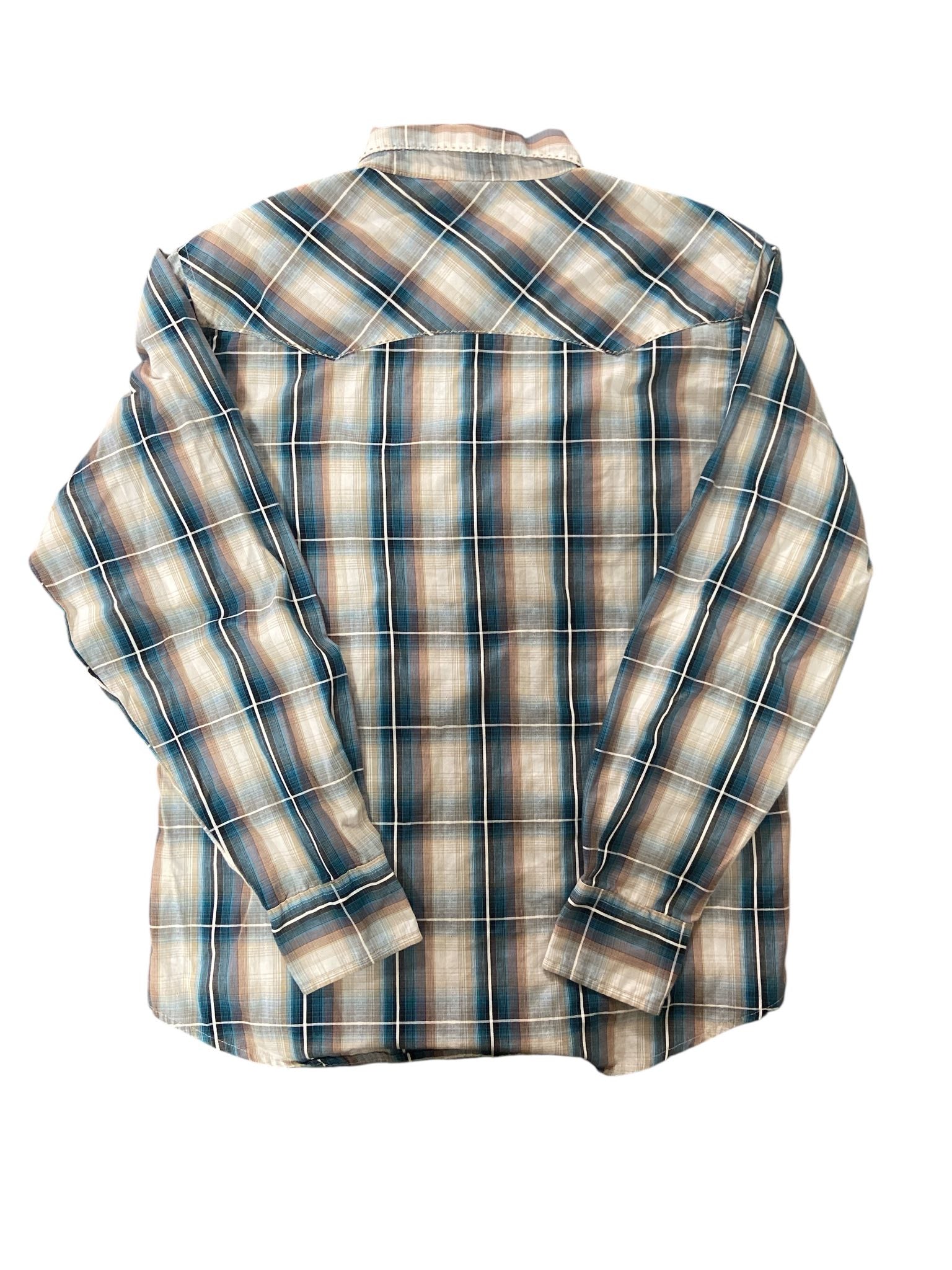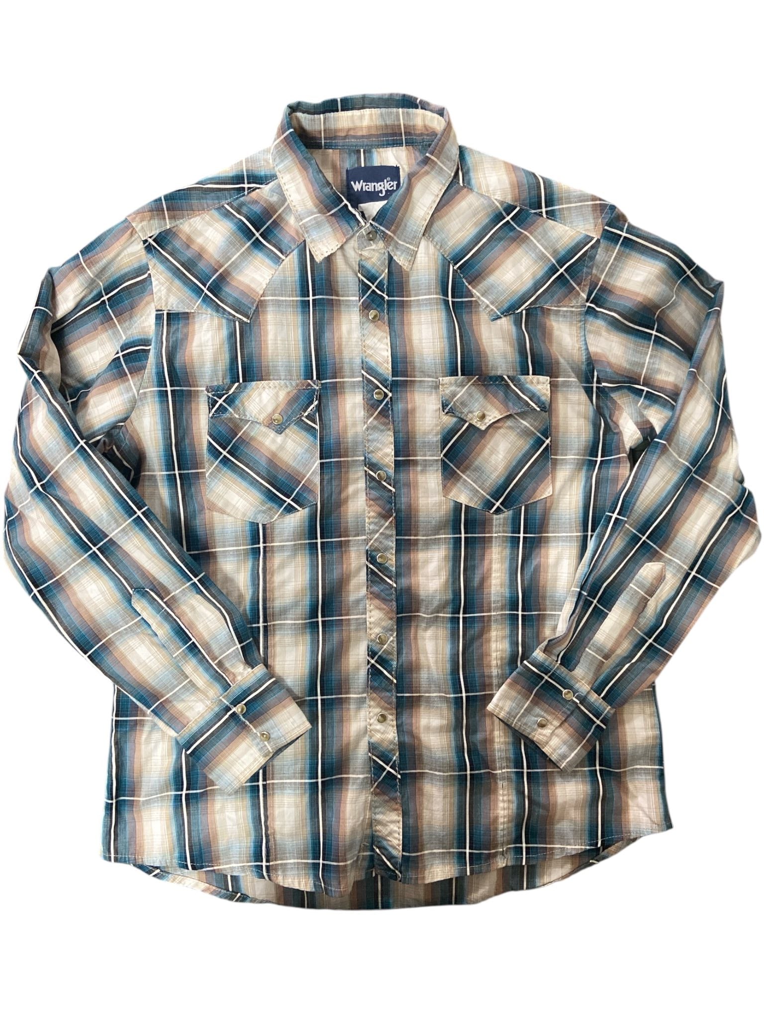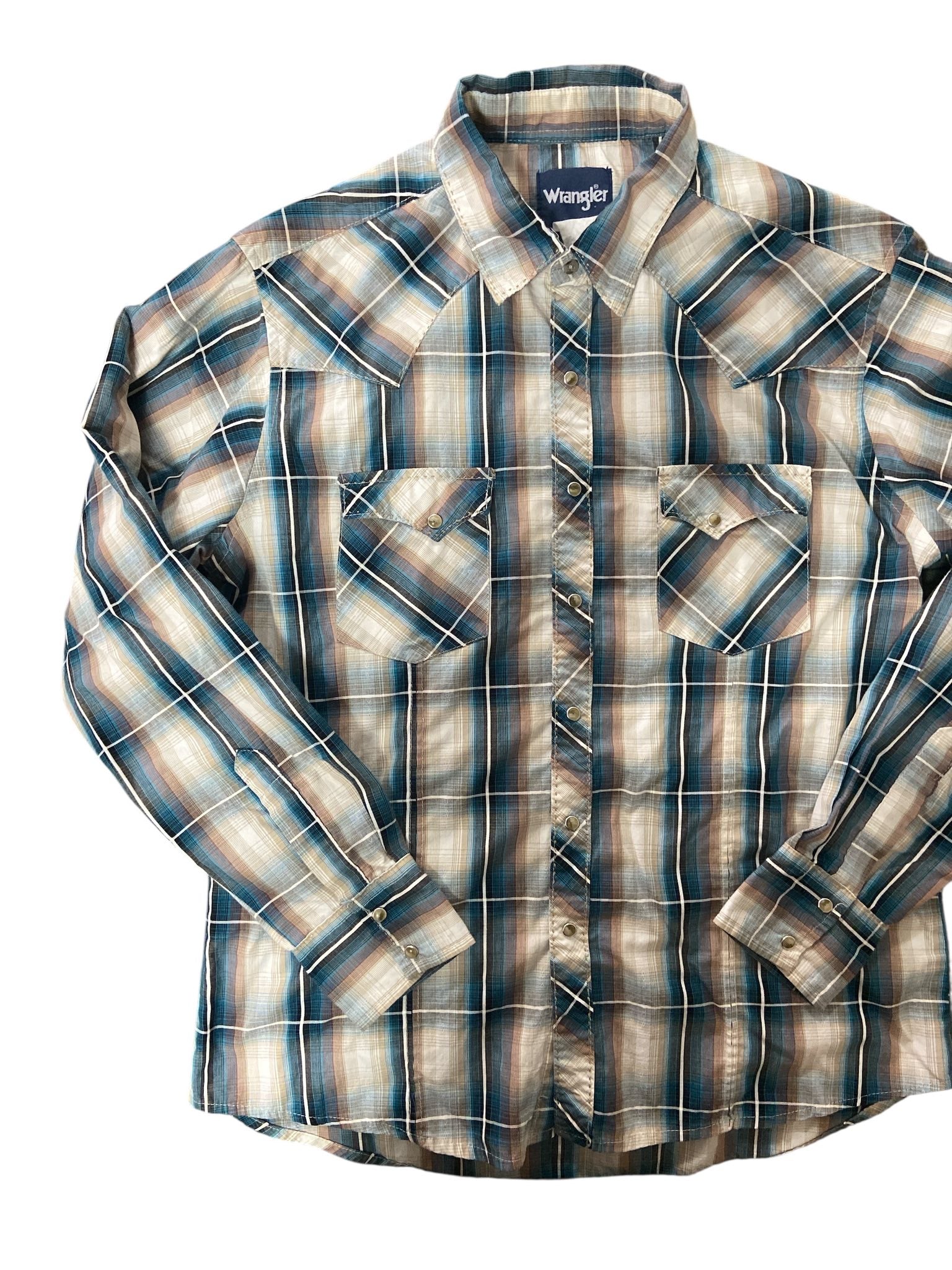 Vintage Wrangler Plaid Pearl Snap Shirt Size XL Tan/Blue