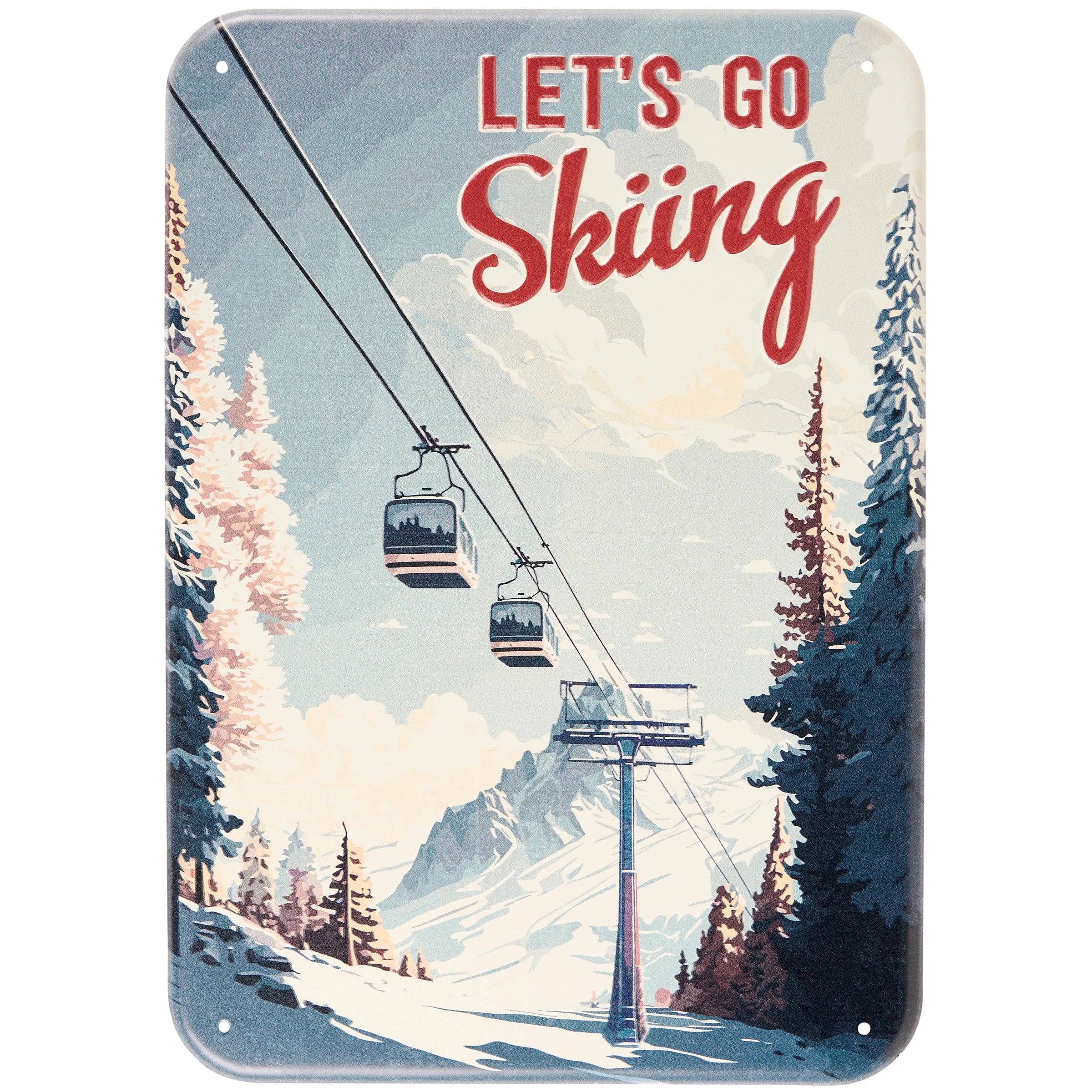 Declare your ski obsession with this spirited "Let's Go Skiing" tin sign! Measuring 10x14, this metal beauty features a playful design that captures the excitement of hitting the slopes. Built to last with sturdy tin construction, it's perfect for ski cabins, lodge walls, or anywhere you want to celebrate winter's greatest adventure. Hang it up and let everyone know where your heart belongs—on the mountain!