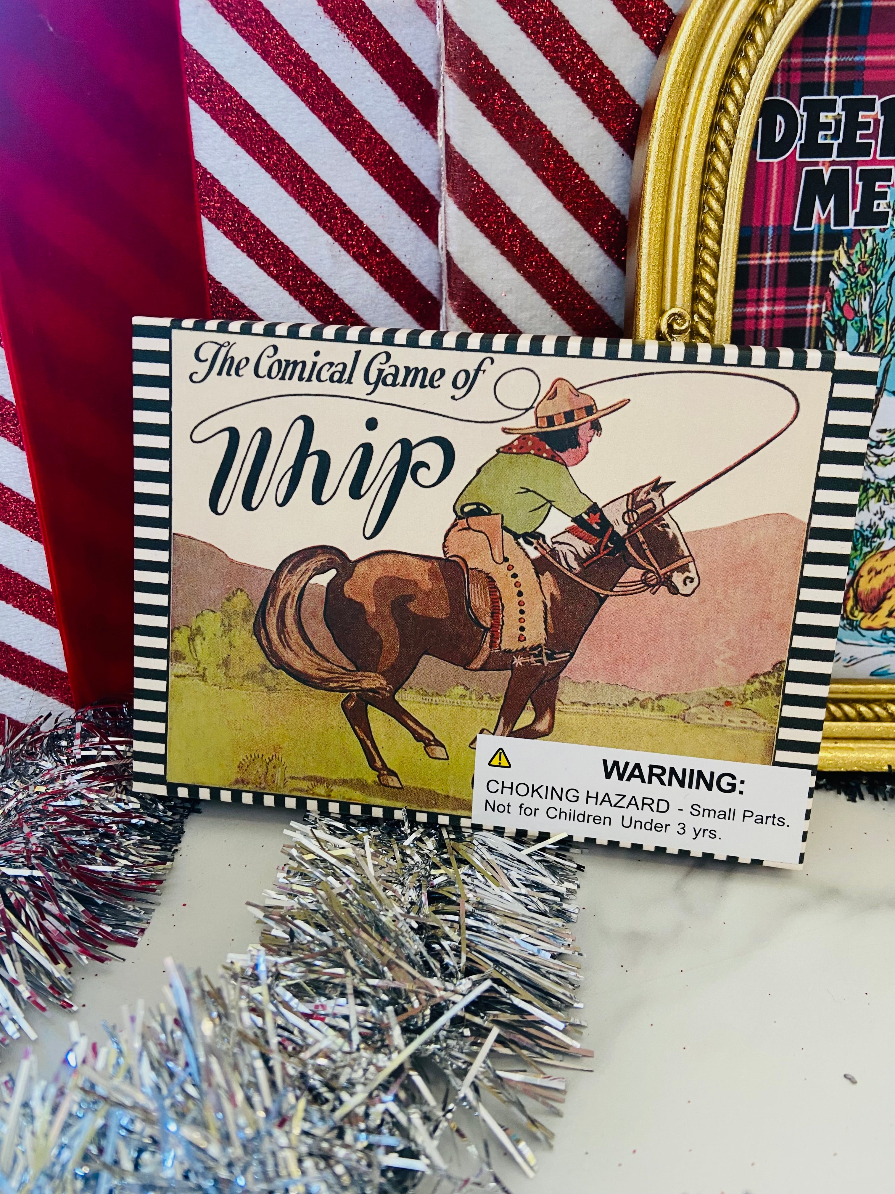 Get ready for hilarious card-flipping fun with this vintage-inspired twist on the classic Snap game! Every card features clever interpretations of "whip" and "whipped," creating laugh-out-loud moments as you race to match them. Fast-paced, exciting, and endlessly entertaining, it's the perfect game night addition for ages 6 and up. Compact enough to take anywhere at just 6.5" x 5" x 0.5". A delightfully quirky game based on a charming 1940s design that brings retro fun to modern play.