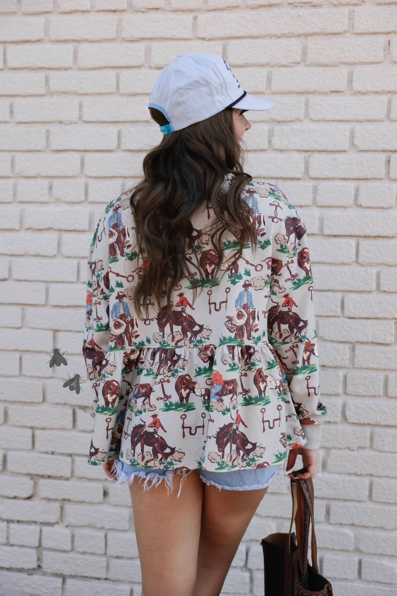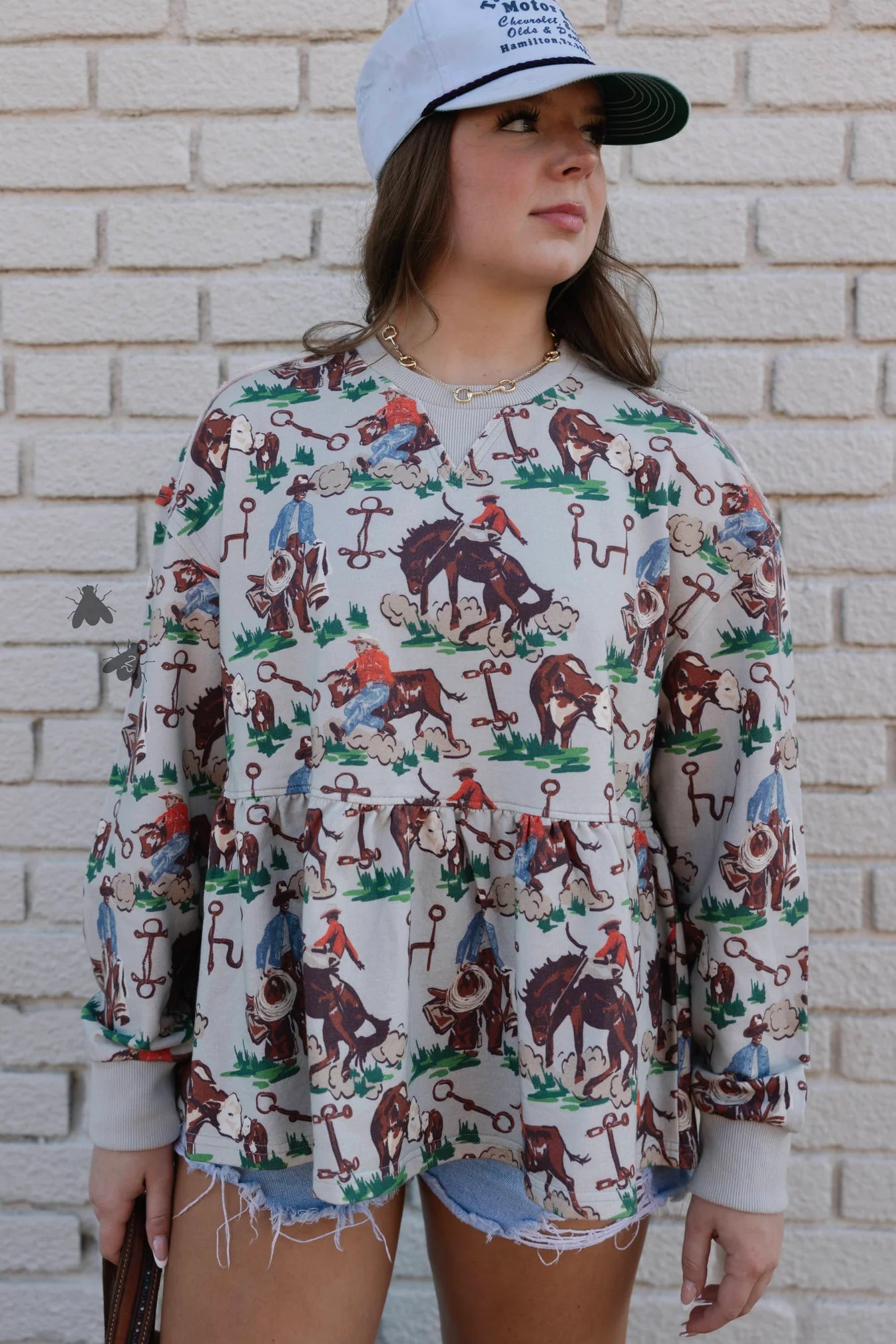 Slip into effortless western charm with this babydoll sweatshirt—designed with a flattering, relaxed silhouette that hugs in all the right places. The oversized fit pairs perfectly with high-waisted cuffed jeans and your favorite silver jewelry for that laid-back cowhand aesthetic. Cozy, cute, and ready for anything from coffee runs to casual hangouts.