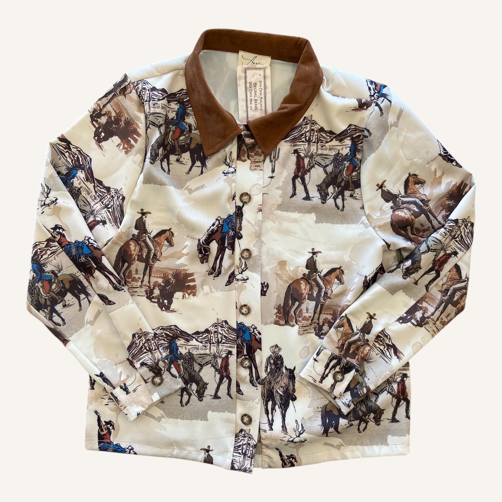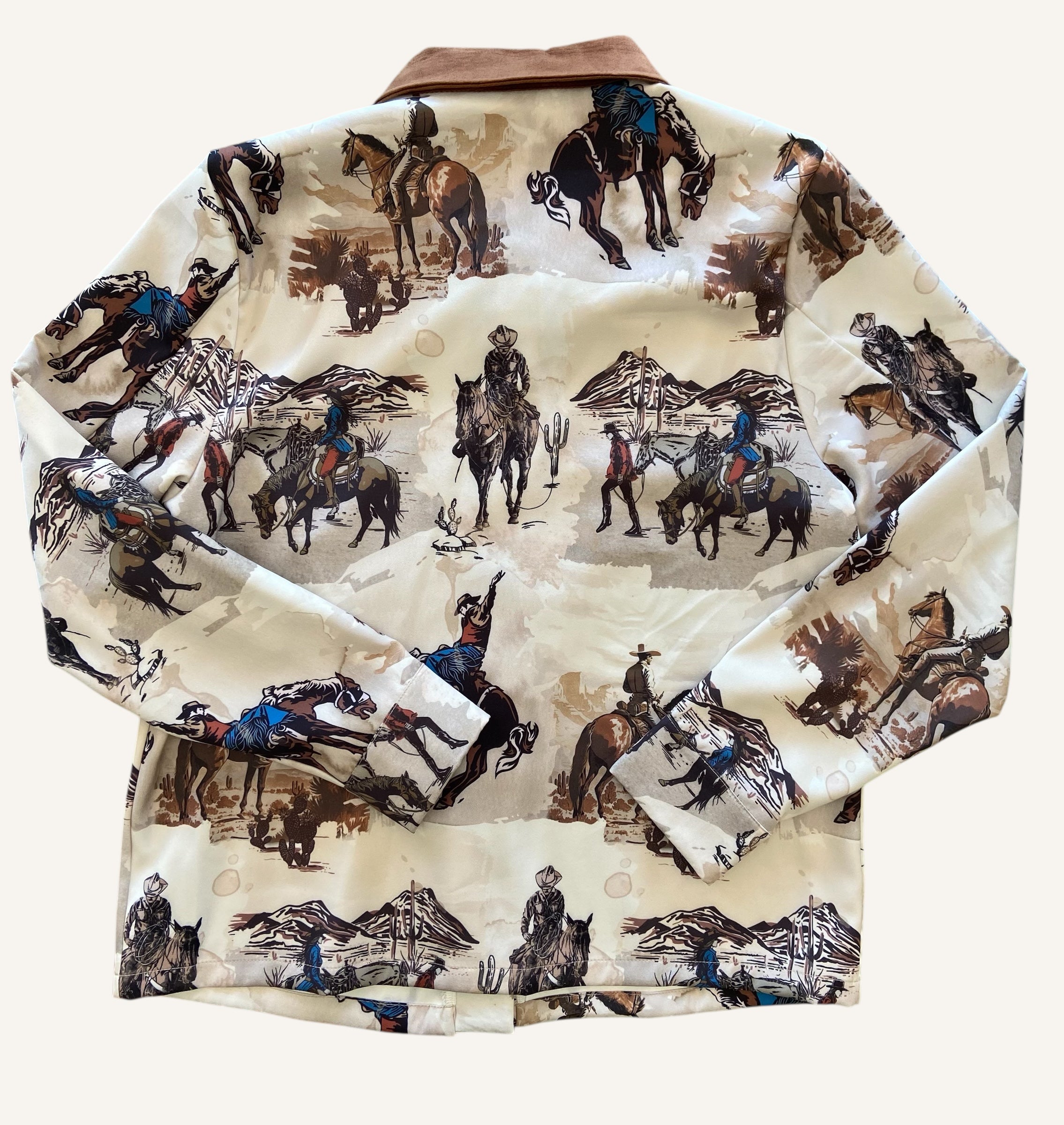 Saddle up in style with this charming barn jacket featuring a whimsical cowboy print that captures the spirit of wide-open spaces. Crafted in a lightweight fabric, it's perfect for layering on crisp mornings or tossing over your favorite tee. The slightly oversized cut delivers that effortless, relaxed vibe—ideal for ranch days, casual outings, or anyone who loves a touch of western charm. Durable and adorable, this jacket pairs beautifully with jeans, boots, and a confident attitude.