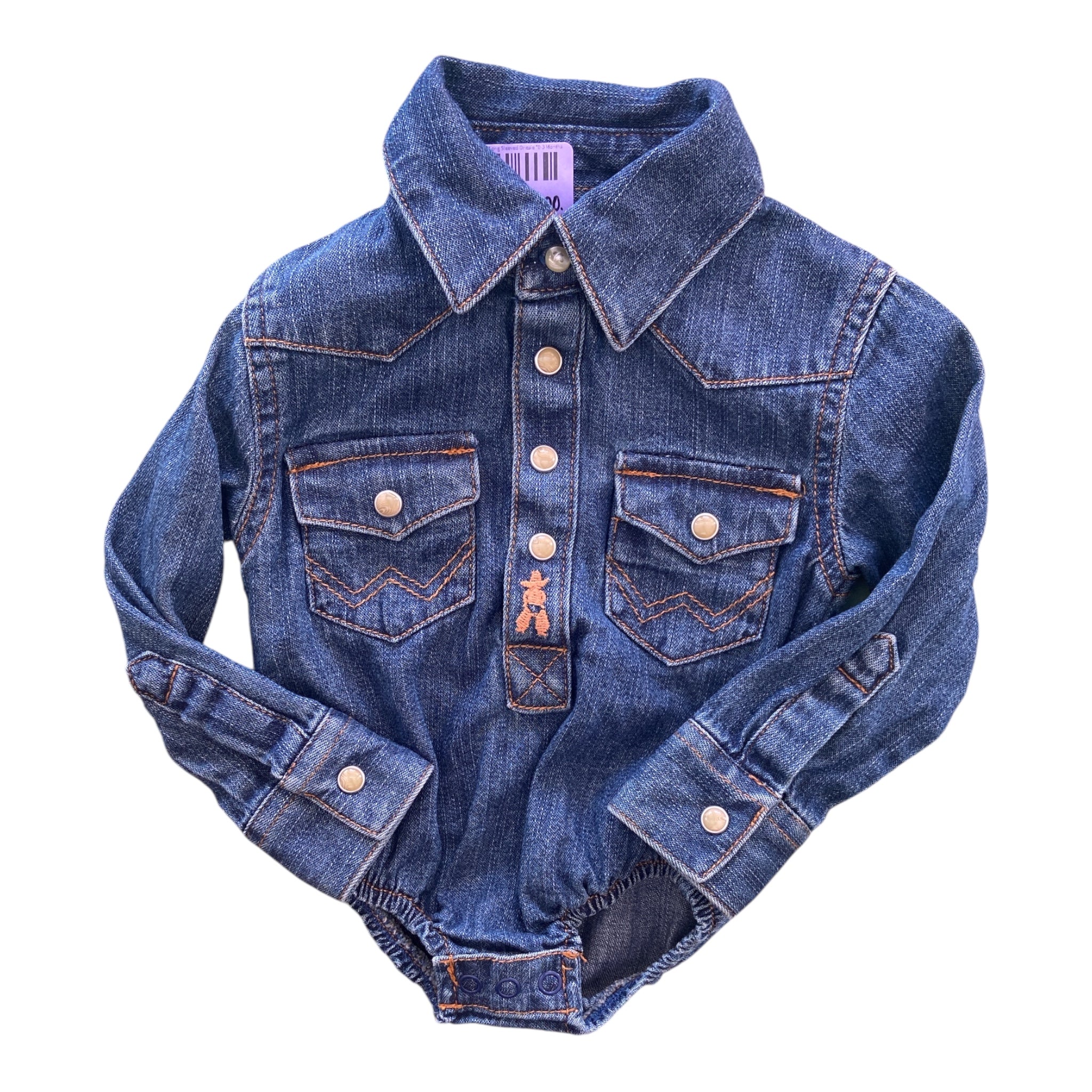 Pre-Loved Wrangler Denim Long Sleeved Onesie *0-3 Months is backordered and will ship as soon as it is back in stock.