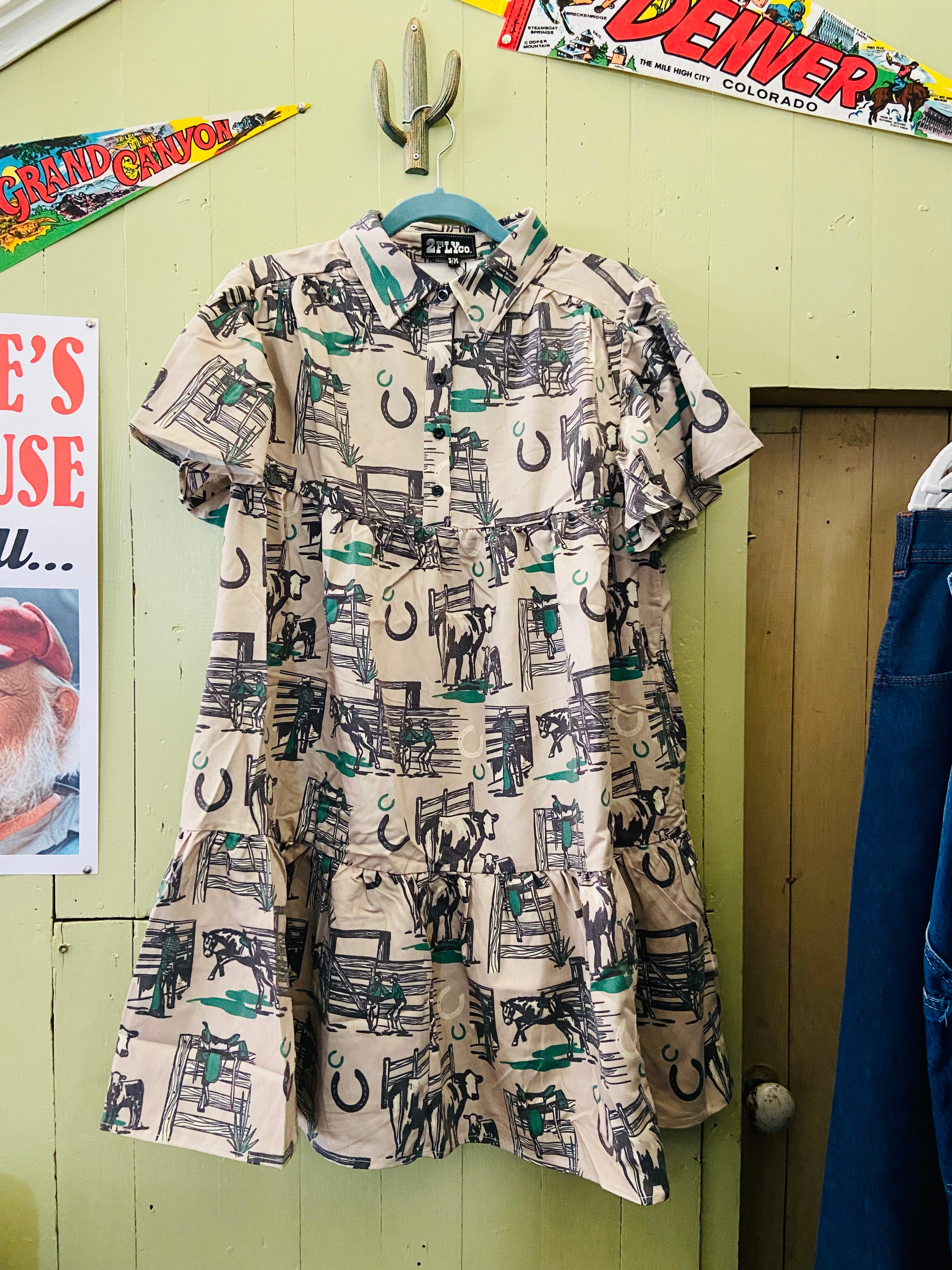 This vintage-inspired western dress is the whole vibe—that pattern is everything. Wear it solo for maximum impact or layer it with a knit vest for a polished, put-together look. Either way, you're channeling effortless cowgirl cool. Perfect for styling your own way.