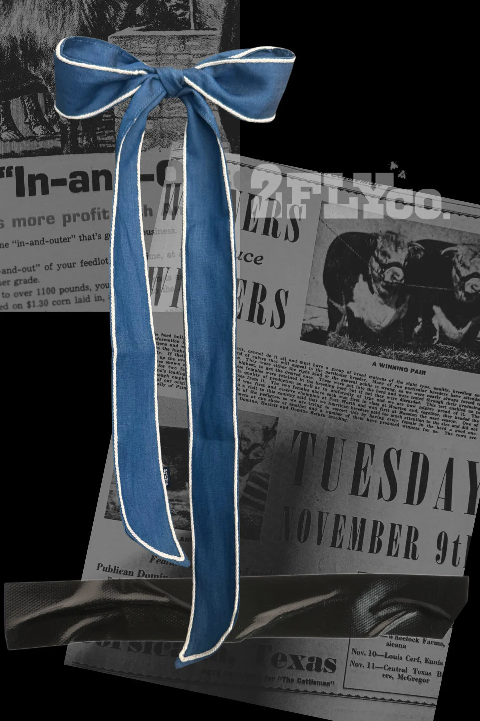 Wrangle your style with this denim twilly featuring a rustic rope-like trim that adds authentic western flair. Perfect for tying back hair, securing a hat, or cinching a bag with character. The sturdy denim pairs beautifully with the textured rope detail for a look that's equal parts practical and charming. A small accessory that makes a big statement for any adventure-ready outfit.