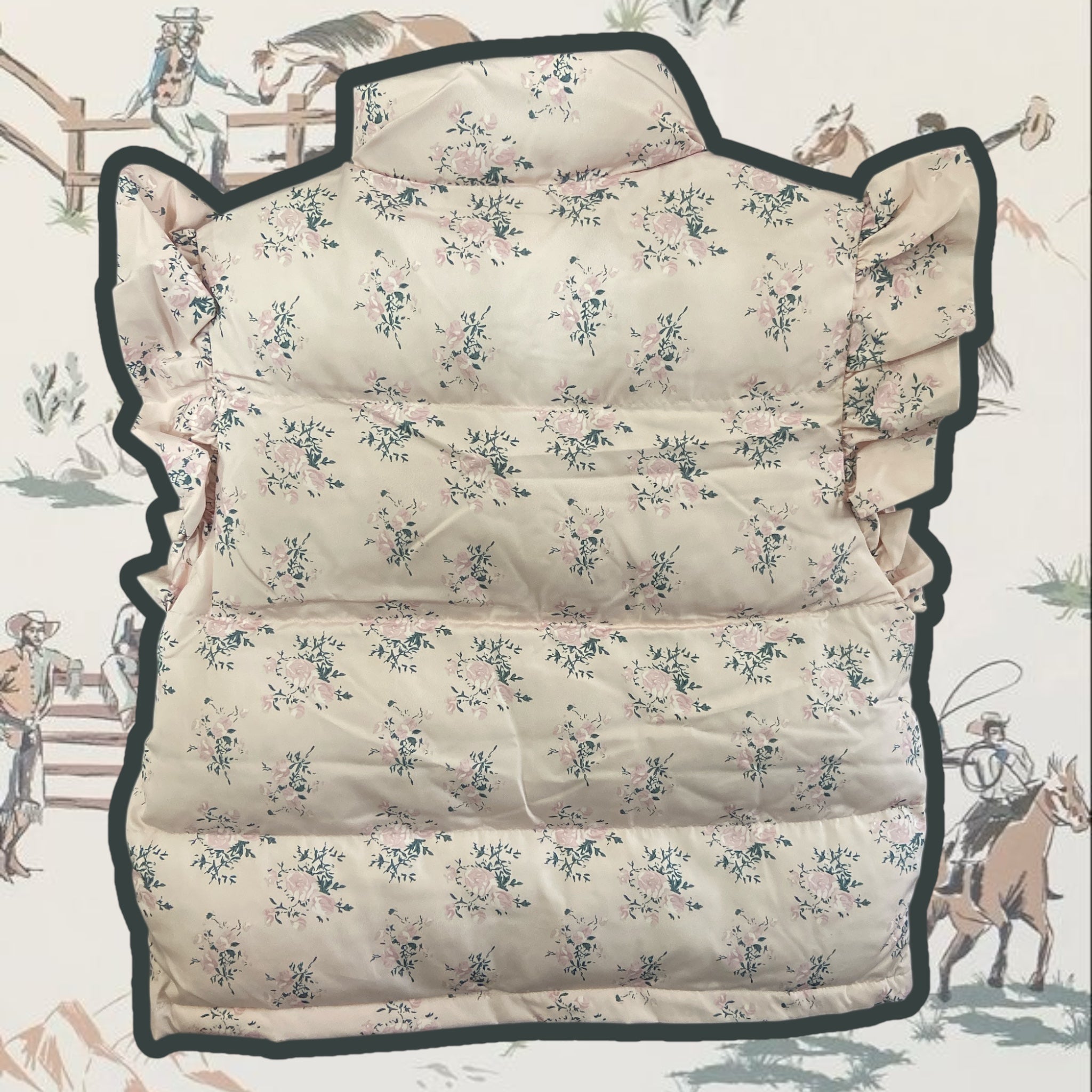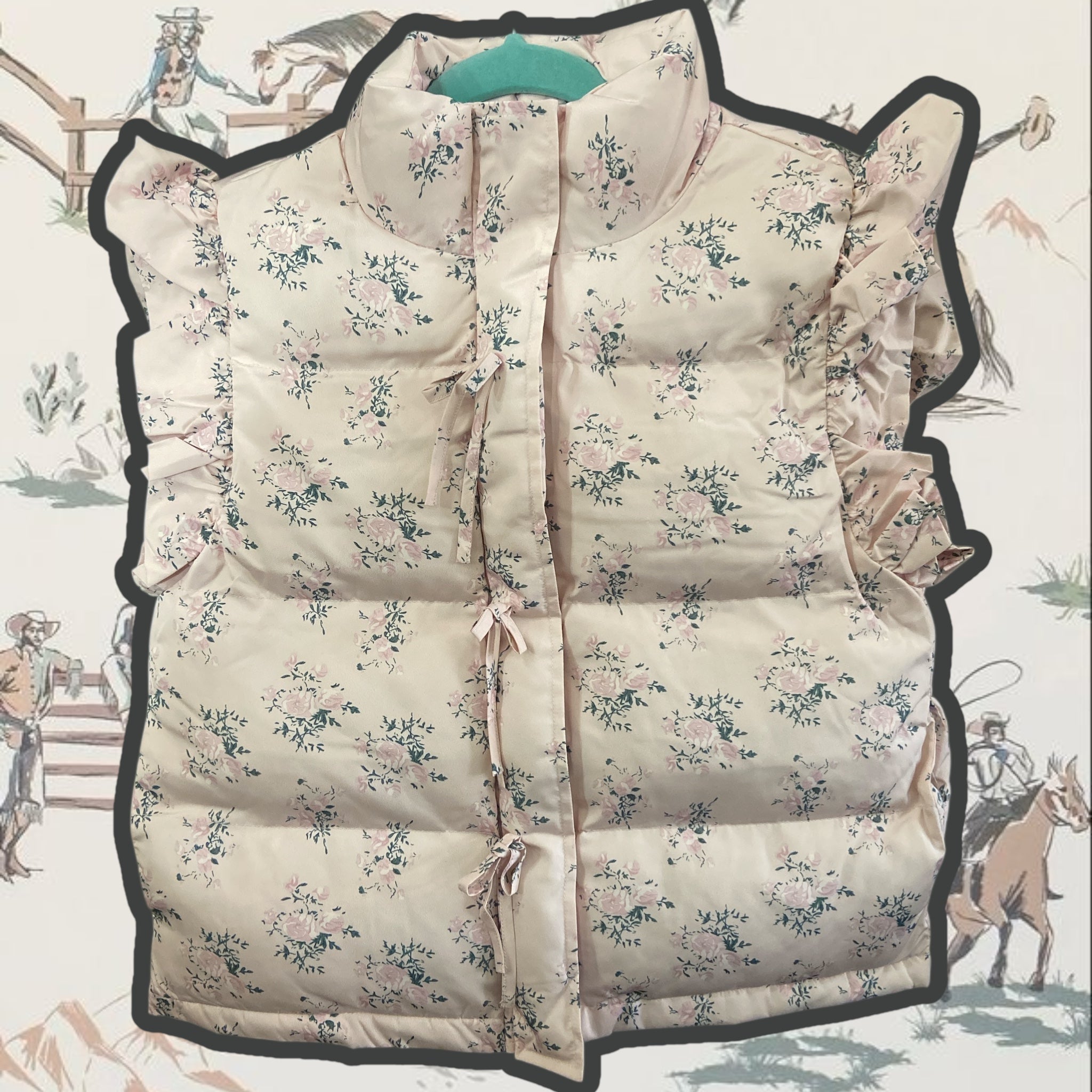Stay snug and stylish in this thick, warm puffer vest that doesn't skimp on charm. The blooming pink floral design pairs beautifully with a sweet front bow and ruffled sleeves for a look that's equal parts cozy and cute. Built for serious warmth without the weight, this vest layers perfectly over sweaters or stands alone on milder days. A playful essential that proves you can be both toasty and totally adorable.