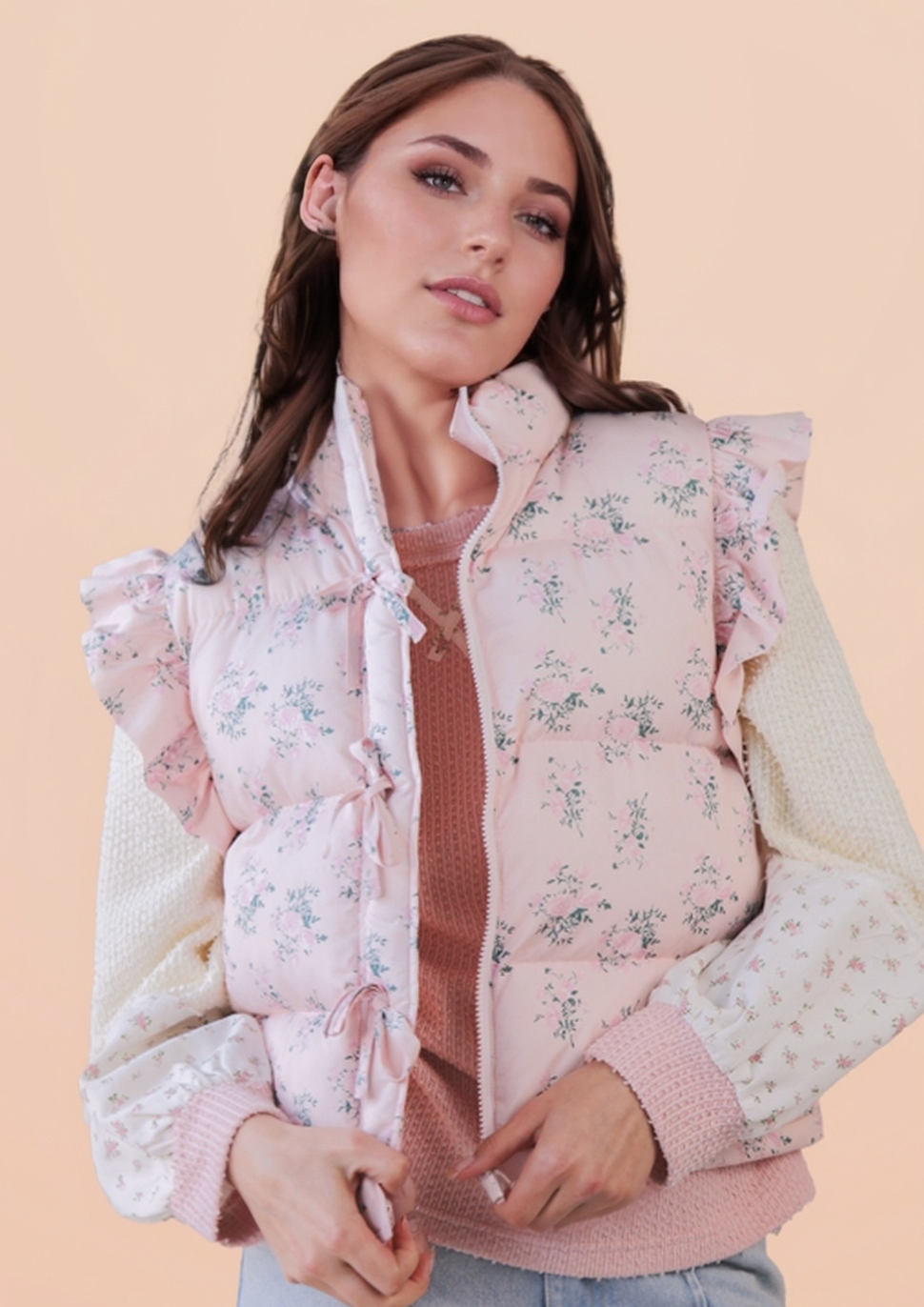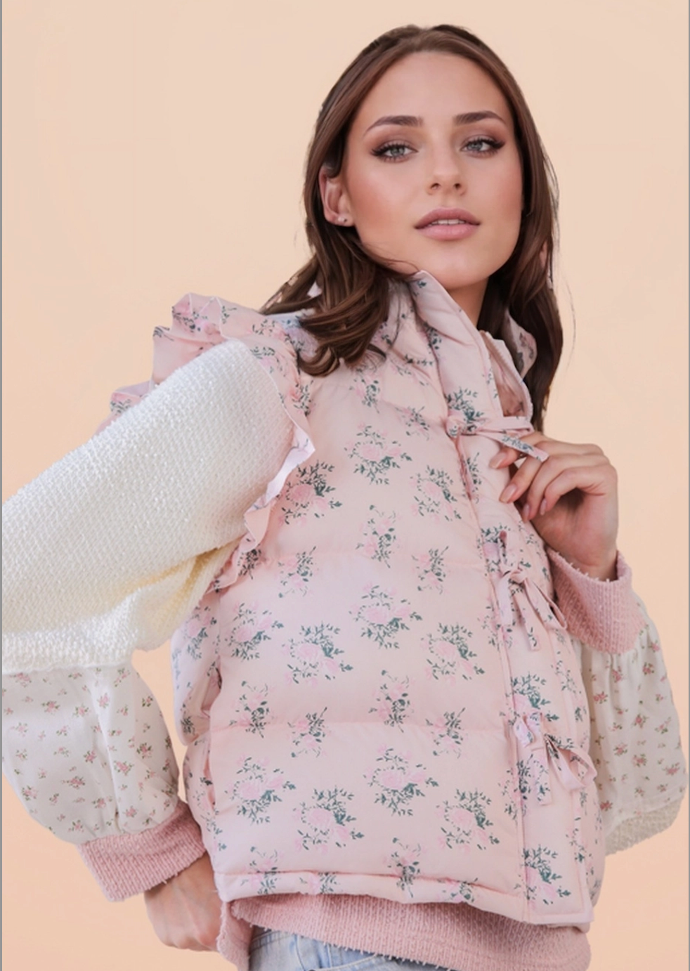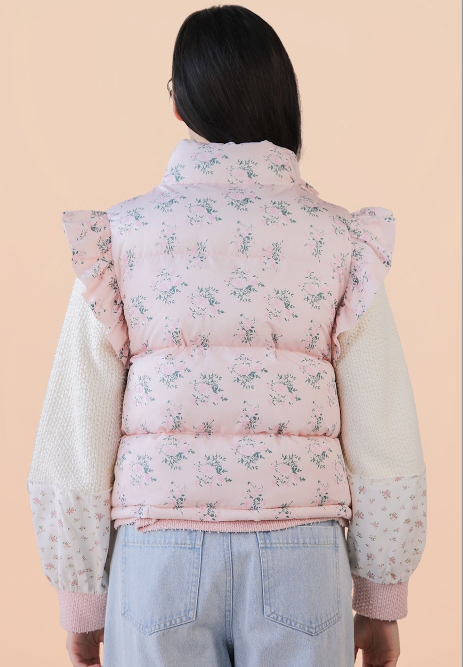 Front Bow Ruffle Sleeve Puffer Vest - Floral Pink