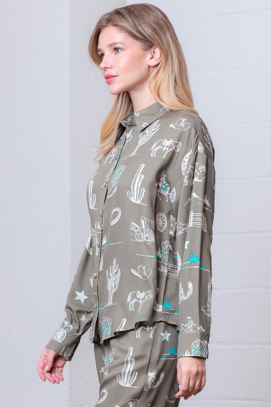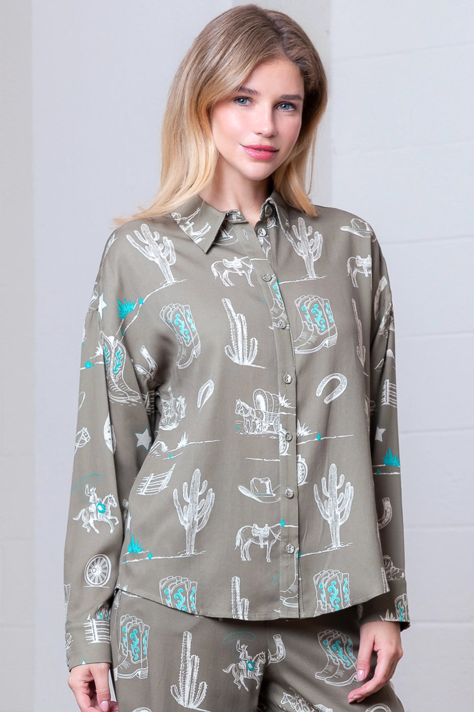 The Buckaroo Long Sleeve Button Down Shirt brings western charm with a fun twist. This oversized collared button-down features an adorable western print that captures authentic ranch spirit with a lighthearted edge. Perfect for layering or wearing solo, the relaxed fit offers comfort without sacrificing style. Whether you're heading to a rodeo, weekend getaway, or just want to add some personality to your everyday rotation, this shirt delivers that effortless western vibe!