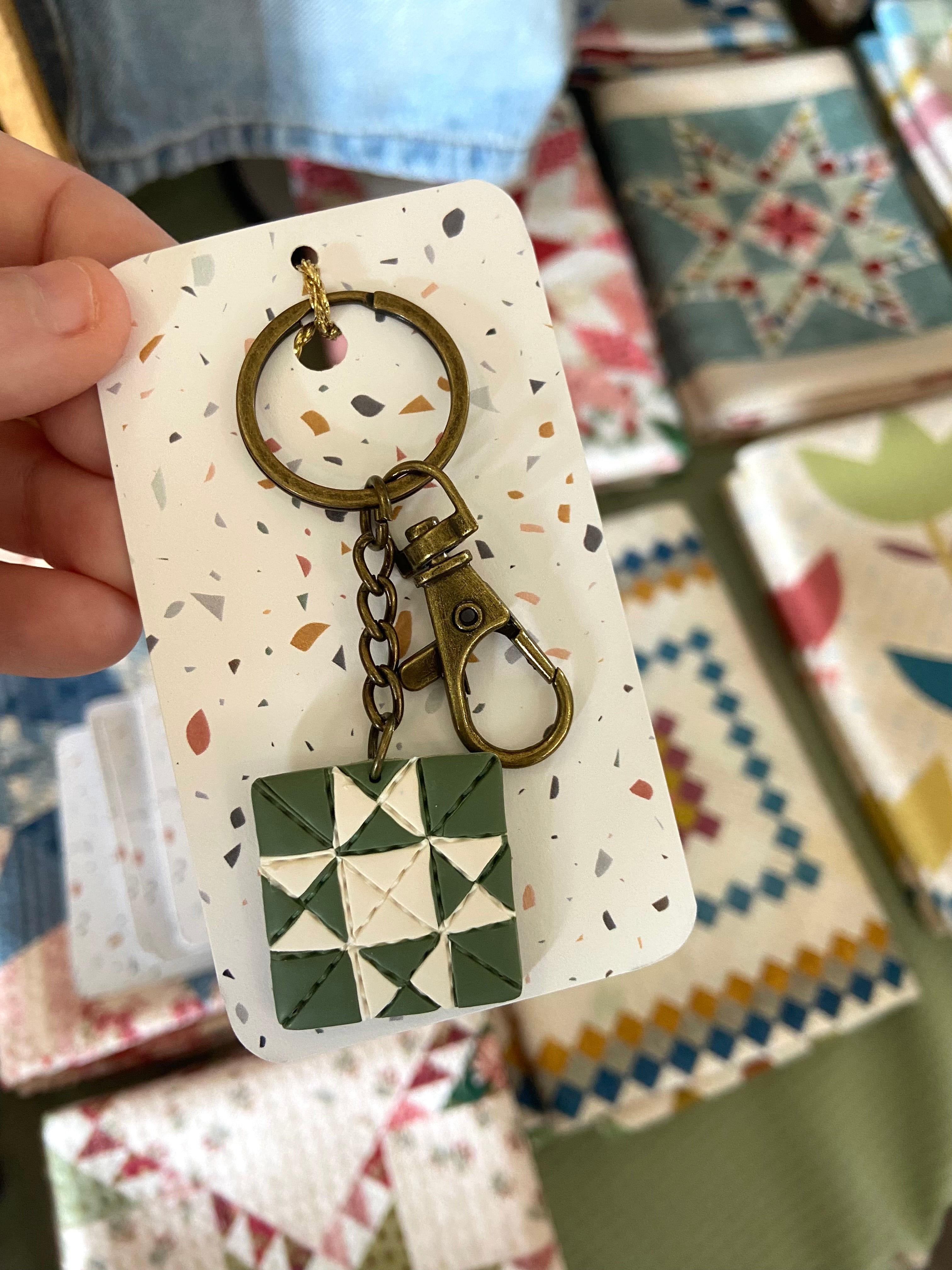 Unleash your inner whimsy with the Cottage Bliss Quilt Pattern Keychain! Handcrafted with clay, this keychain is a unique and playful accessory. Show off your love for all things cottage and cozy with this one-of-a-kind piece. Perfect for adding a touch of personality to your keys.