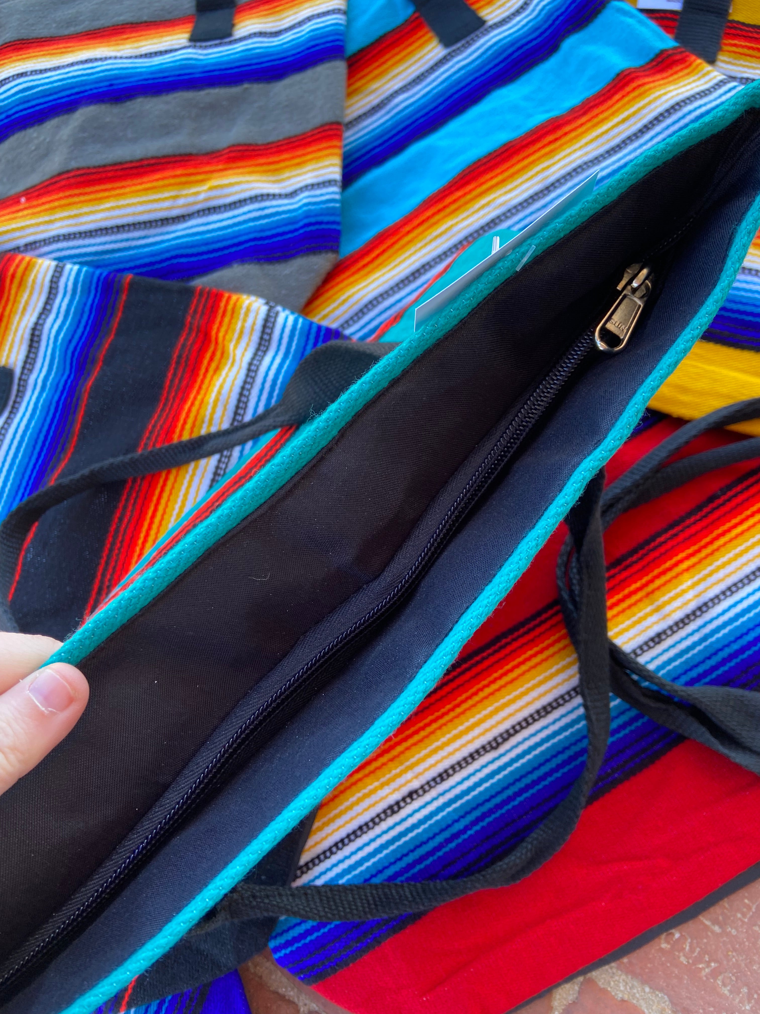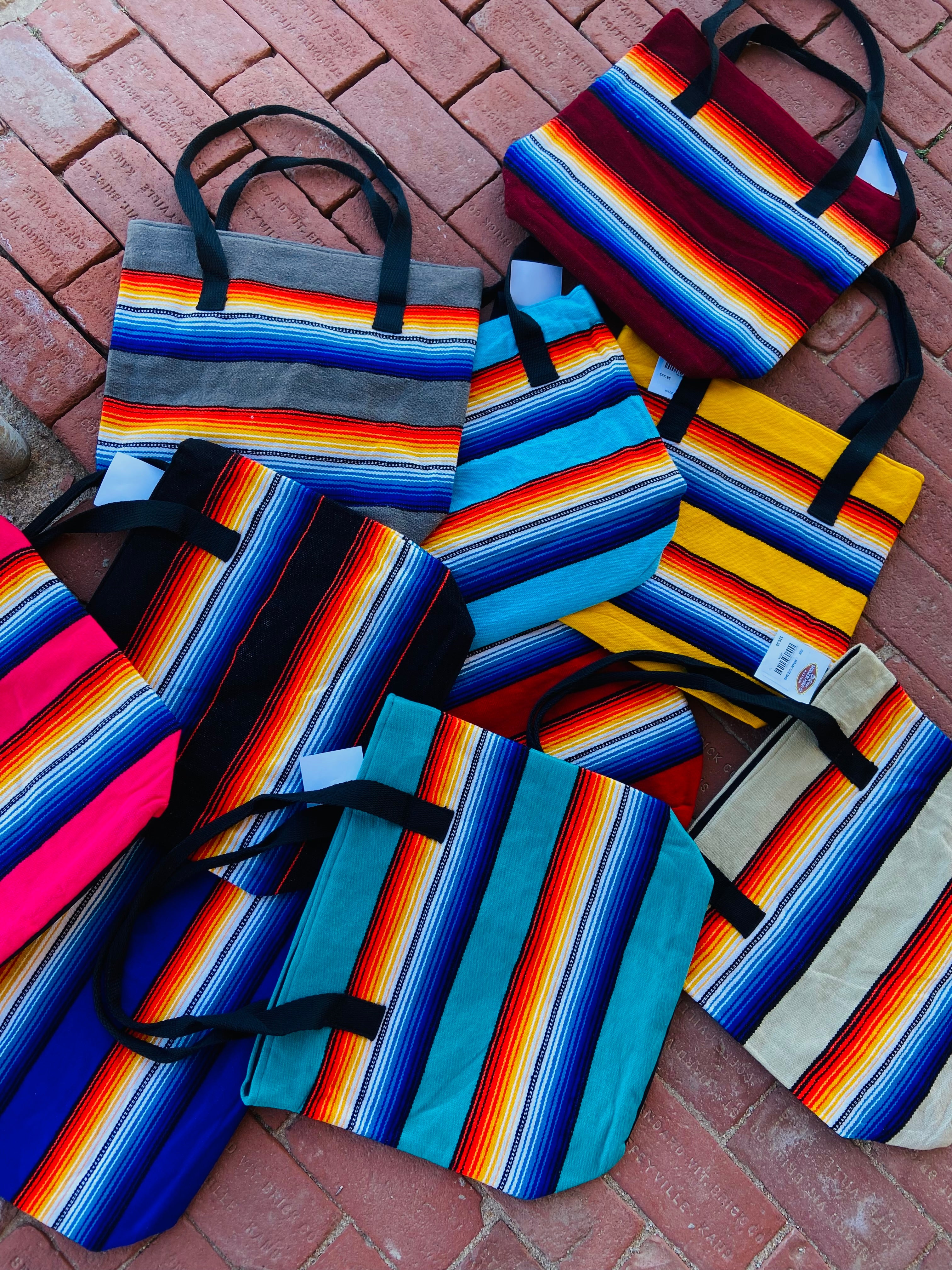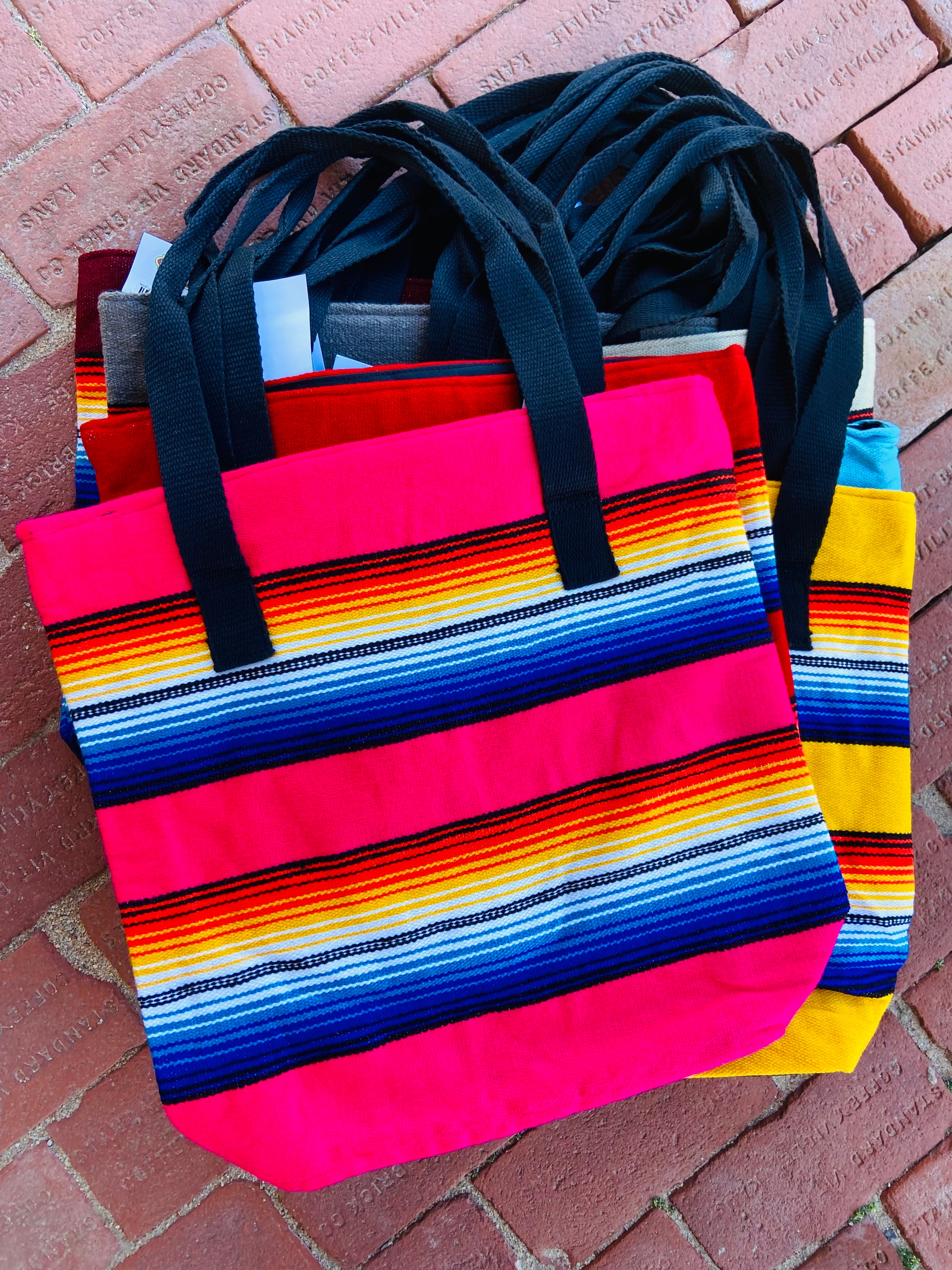This stunning serape tote bag is a must-have for travelers and everyday use. Made with durable acrylic materials, imported, each bag measures approximately 12" x 6" x 13", providing plenty of room for your belongings. Stylish and functional, this bag is great for work or play.