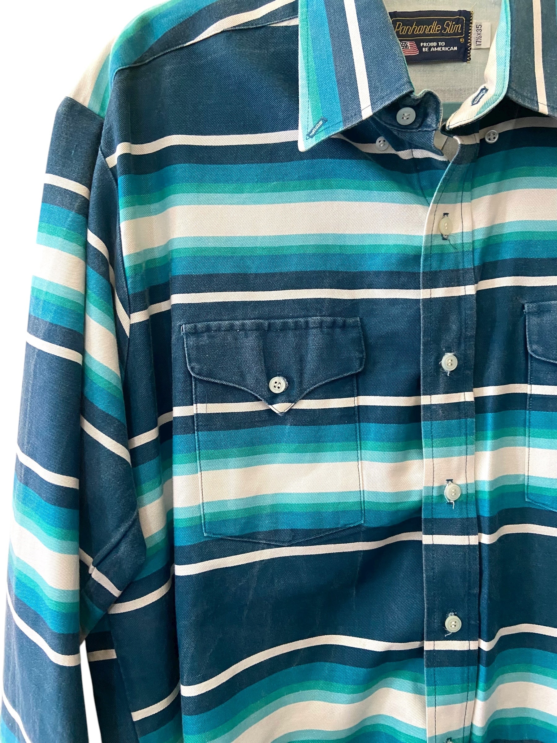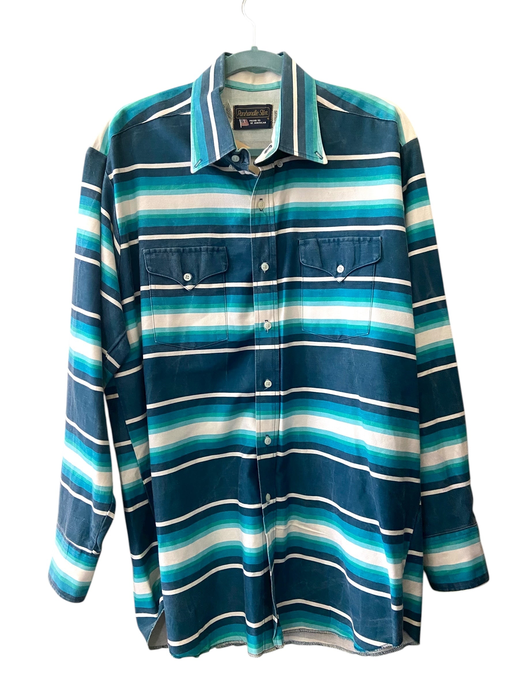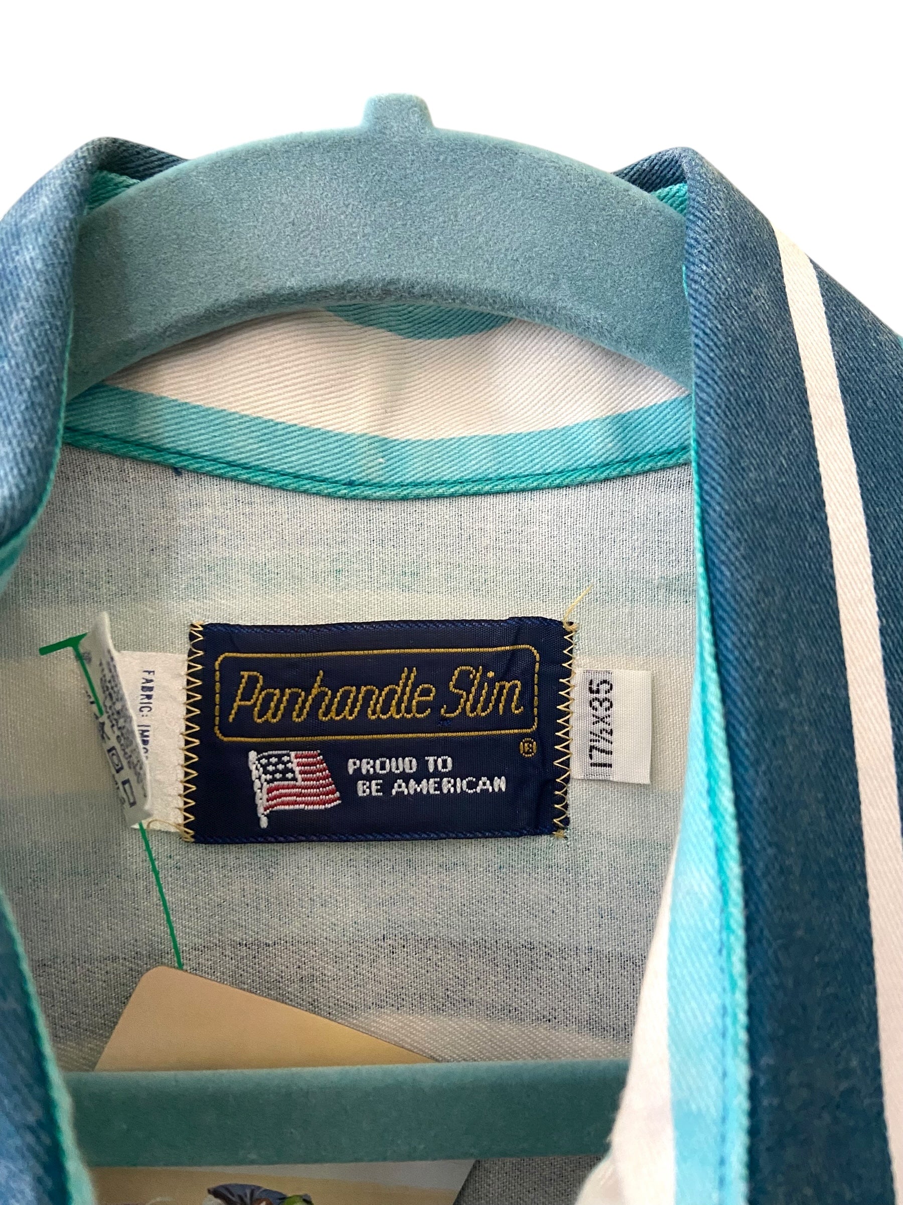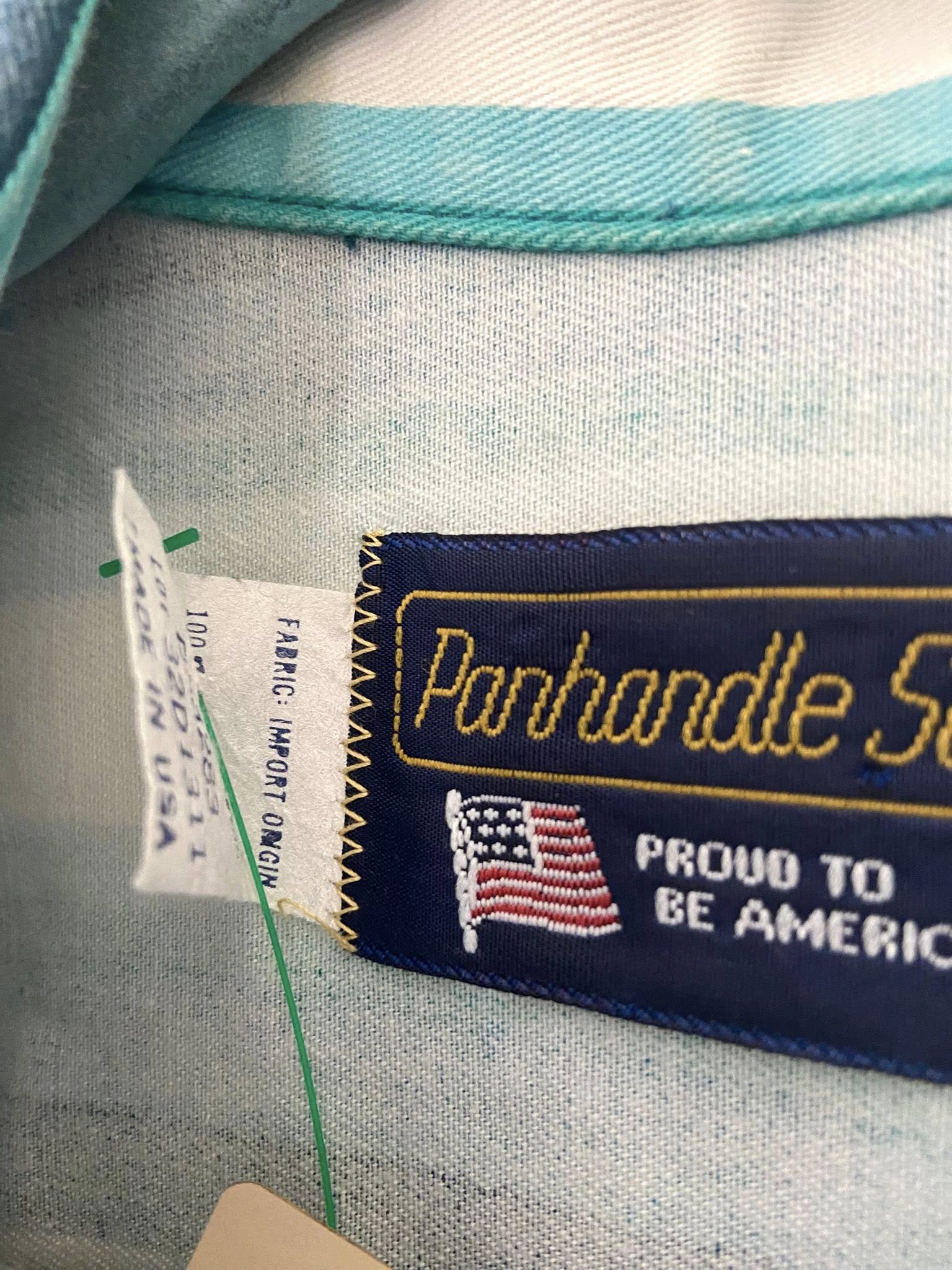 This Vintage Panhandle Slim Brush Popper shirt, size 17 1/2 x 35, is a colorful tribute to '90s Western style. Made in the USA, it features great colors with a slightly faded print that seems designed to capture that authentic vintage look. In good condition for its age, it’s an iconic piece that adds playful charm and rugged character to your wardrobe.