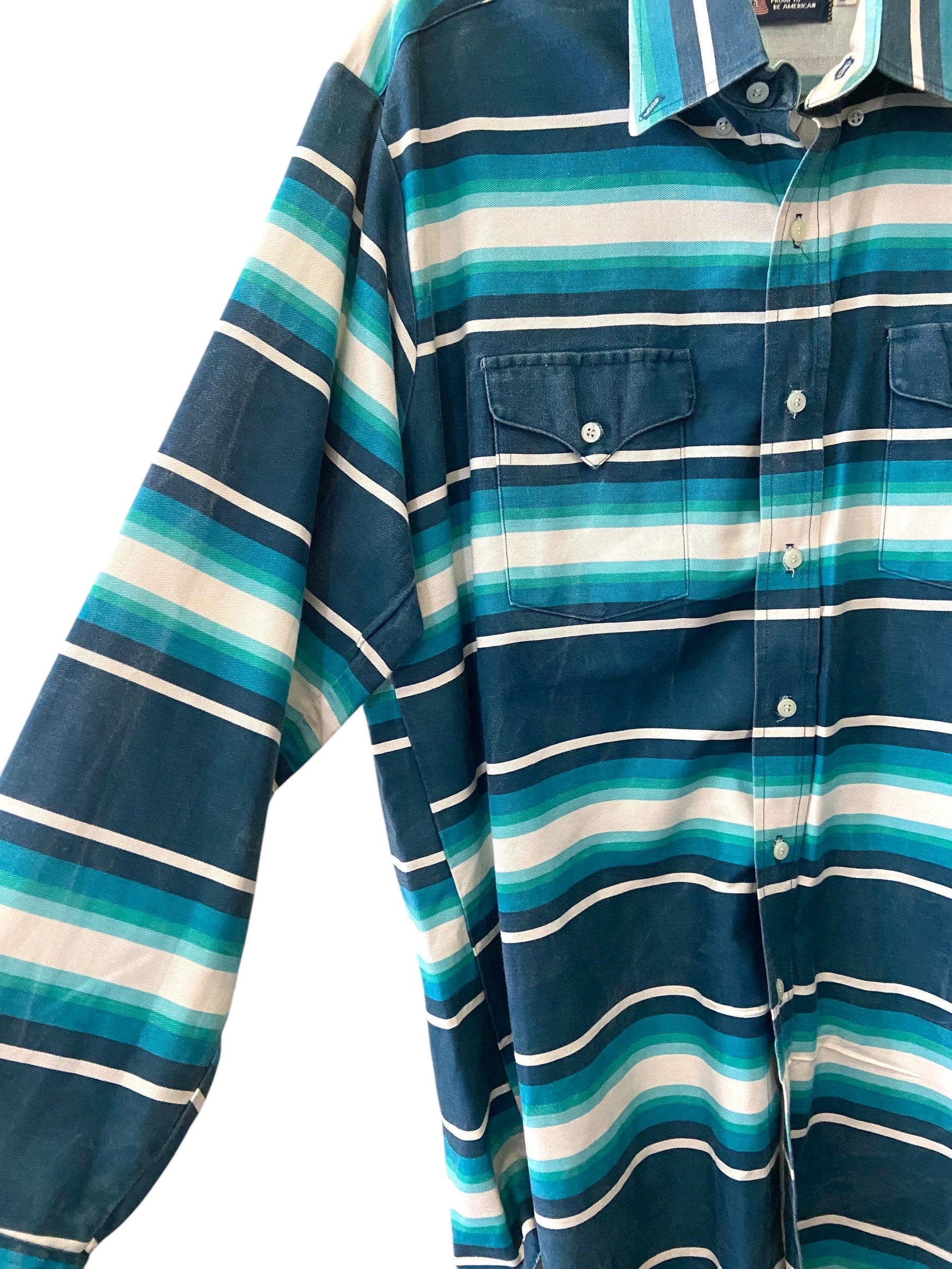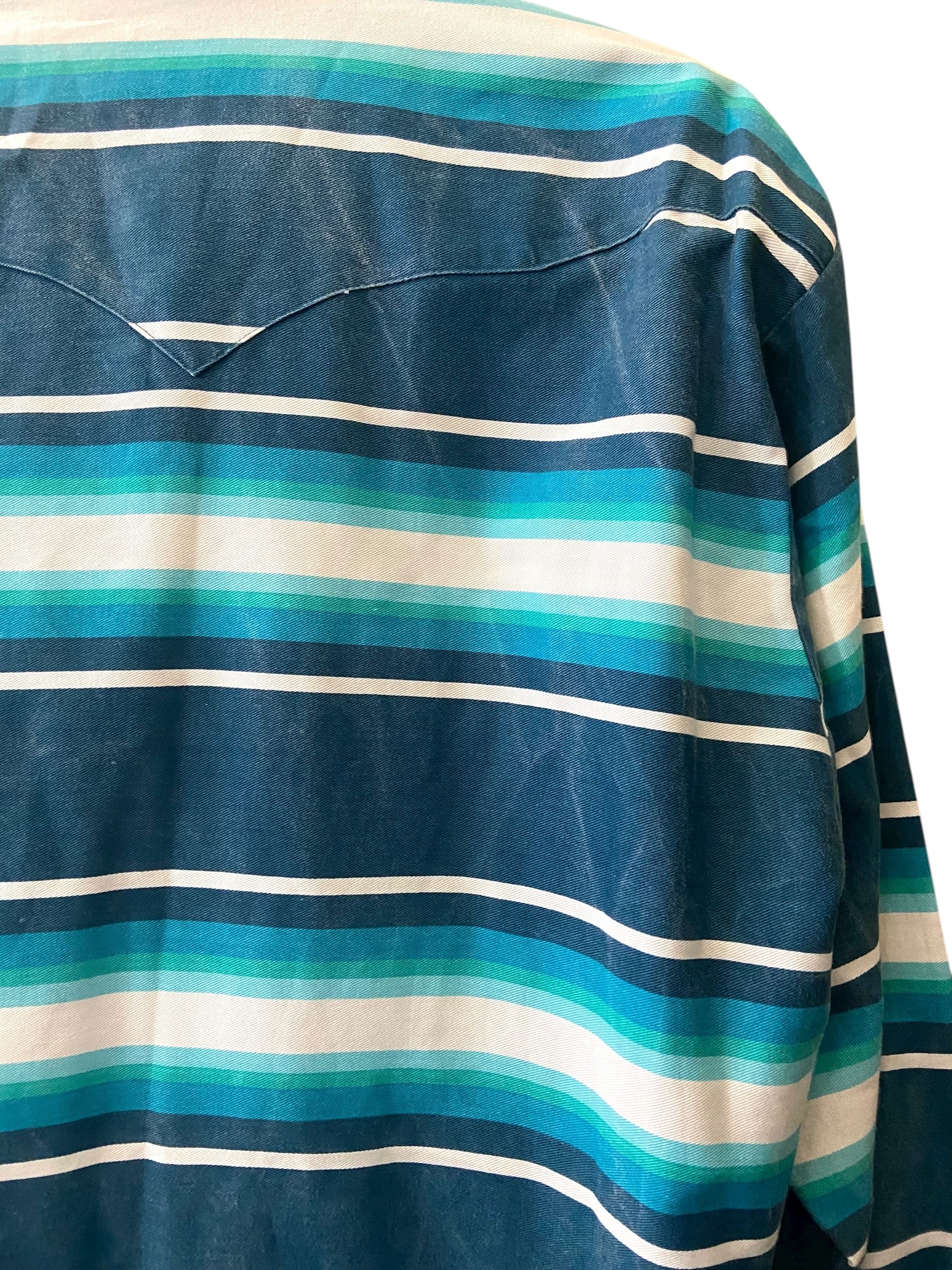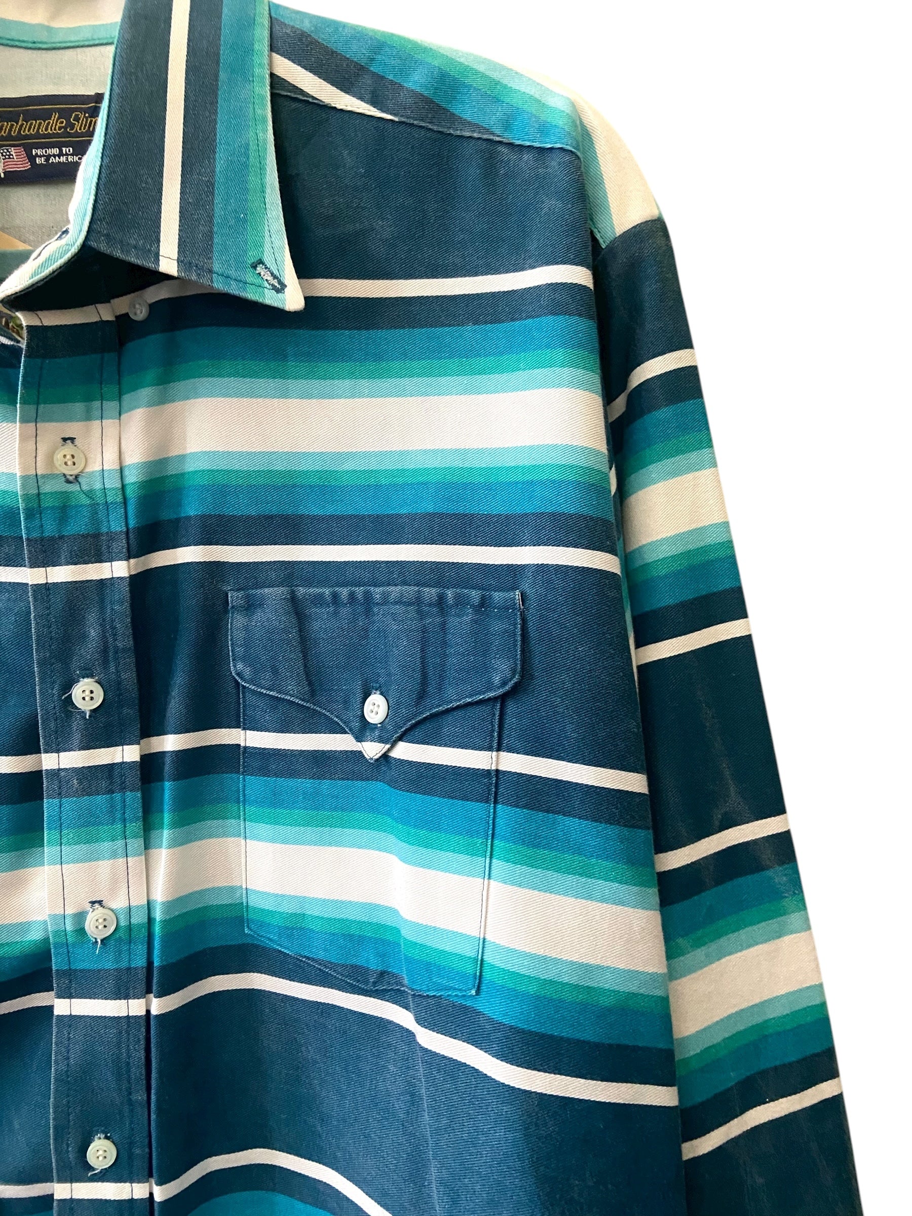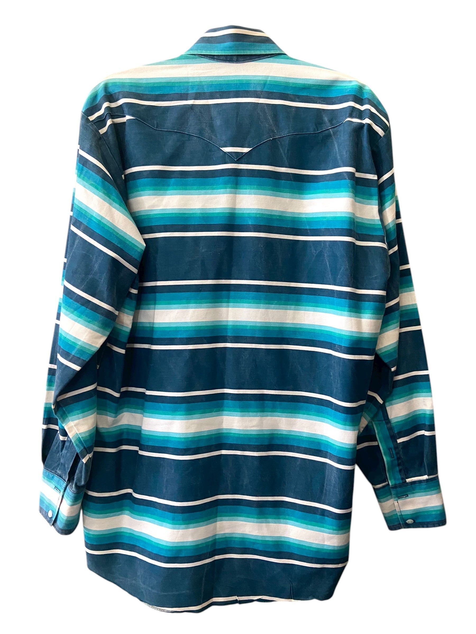 This Vintage Panhandle Slim Brush Popper shirt, size 17 1/2 x 35, is a colorful tribute to '90s Western style. Made in the USA, it features great colors with a slightly faded print that seems designed to capture that authentic vintage look. In good condition for its age, it’s an iconic piece that adds playful charm and rugged character to your wardrobe.