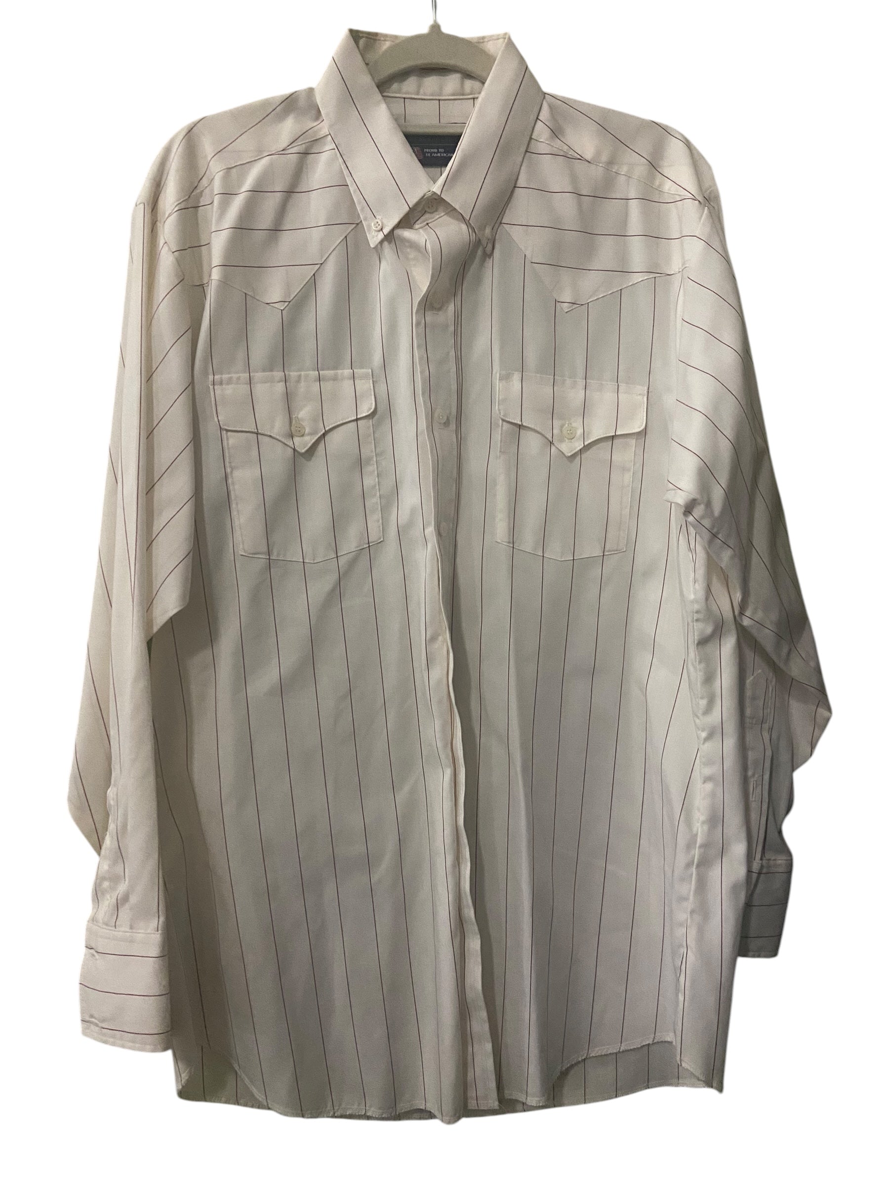 Step back in time with this vintage Panhandle Slim shirt, proudly made in the USA. Its crisp white fabric is playfully accented by a bold dark burgundy stripe, adding a splash of character to your look. Sized at 16 1/2 x 34, this shirt is in great condition and ready to bring a touch of retro charm to your wardrobe. Perfect for those who love a classic with a twist!
